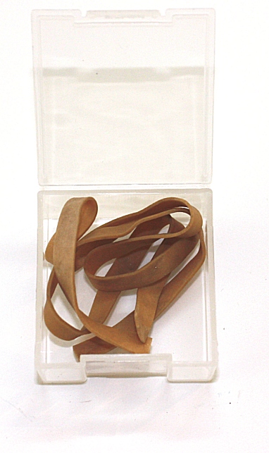 Artifacts from a performance work by Cecil Touchon at the A Book About Death Exhibition at the Emily Harvey Foundation Gallery in New York City. Note: These were some of the rubber bands used for the world premiere performance of Cecil Touchon's Requiem for Voice and Rubber Bands for George Brecht (who died a few months earlier). Performers and audience used these rubber bands as plucking instruments during the chant. Cantor was Melissa McCarthy. |